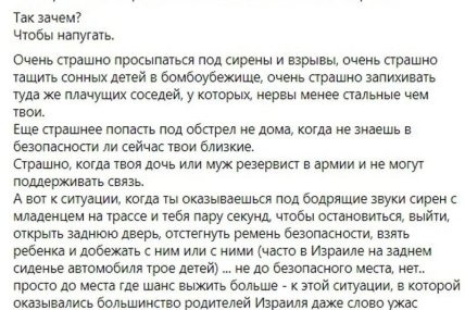 "Еще страшнее попасть под обстрел не дома, когда не знаешь, в безопасности ли сейчас твои близкие. Страшно, когда твоя дочь или муж – резервист в армии и не могут поддерживать связь. А вот к ситуации, когда ты оказываешься под бодрящие звуки сирен с младенцем на трассе и у тебя всего пара секунд, чтобы остановиться, выйти, открыть заднюю дверь, отстегнуть ремень безопасности, взять ребенка и добежать с ним или с ними (часто в Израиле на заднем сиденье автомобиля трое детей) – не до безопасного места, нет, просто до места, где шанс выжить больше – к этой ситуации, в которой оказывались большинство родителей Израиля, даже слово "ужас" слишком мягкое", – приводит реальные примеры Таня.