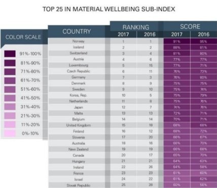 В инвесткомпании Natixis Global Asset Management рассчитали субиндекс материального благополучия для 45 государств с учетом дохода на душу населения, безработицы и равенства доходов.