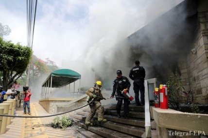 Участники акций в столице Гондураса Тегусигальпе подожгли шины у входа в главное здание посольства США.