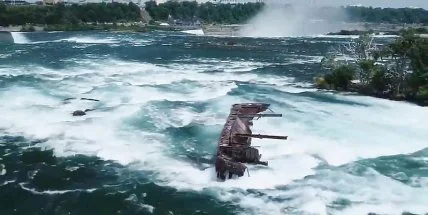 Справка. Баржа оторвалось от буксира во время экспедиции по дноуглубительным работам на канадской реке Ниагара 6 августа 1918 года примерно полутора километрах от Подковообразного водопада, и дрейфовала с двумя членами экипажа на борту к его краю. 51-летний Густав Лофберг и 53-летний Джеймс Харрис открыли нижние люки и затопили трюмы, чтобы замедлить движение к обрыву. Береговая охрана США и канадские власти сумели спасти их к следующему утру. Судно же с той поры так и лежит на скалах
