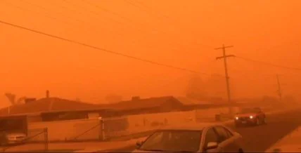 Песчаная буря превратила в яркий красно-оранжевый цвет небо над Австралией, а также резко снизила видимость на дорогах и в аэропорту.