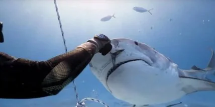 В это время огромная тигровая акула приближается к драйверу. Уэстон просто протягивает ей рыбу и держит определенное время. Морской хищник постепенно приближается и аккуратно начинает есть приманку.