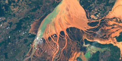 На новом изображении, полученном со спутника НАСА Landsat 8, можно увидеть бурые реки, выходящие из берегов из-за сильного наводнения.