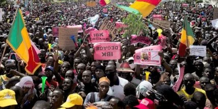 Тысячи людей собрались в столице страны Бамако, чтобы потребовать отставки Кейты из-за долговременных проблем с безопасностью, экономикой и коррупцией.