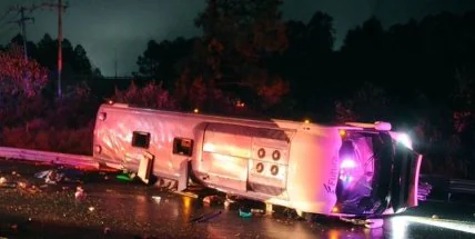 Местные СМИ опубликовали изображения аварии, на которых видно, что автобус компании Futura Select перевернулся на правый бок