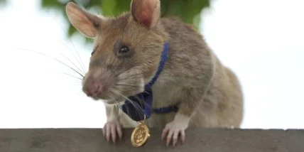 Британская благотворительная ветеринарная организация PDSA вручила крысе по имени Магава свою Золотую медаль за "спасительную верность долгу при обнаружении и обезвреживании смертоносных мин в Камбодже".