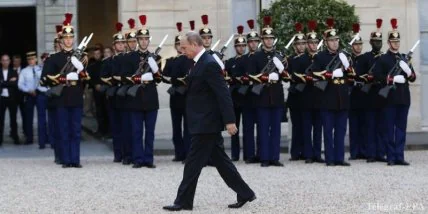 Президент России приглашен во Францию на торжества, посвященные 70-летию операции союзных войск в Нормандии. Главы двух государств обменялись рукопожатием на ступеньках дворца. Во дворе резиденции был выстроен почетный караул.