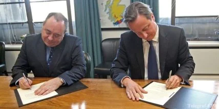 Премьер-министр Великобритании Дэвид Кэмерон и первый министр Шотландии Алекс Сэлмонд подписали в Эдинбурге соглашение о проведении референдума о независимости Шотландии. Текст соглашения размещен на сайте британского правительства (документ PDF).