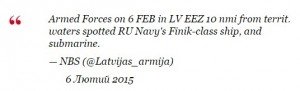 "Вооруженные силы 6 февраля в исключительной экономической зоне Латвии на расстоянии 10 морских миль от территориальных вод страны (около 18,5 км.) зафиксировали военный корабль РФ класса Finik, а также подводную лодку", - говорится в сообщении.
