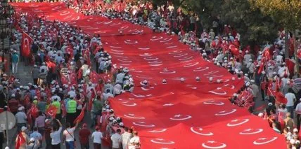 "Террору - нет, братству - да!", "Родина неделима!", - декларировали свою позицию граждане. Как символ единения, демонстранты во время движения передавали из рук в руки огромный турецкий флаг (1500х7м).