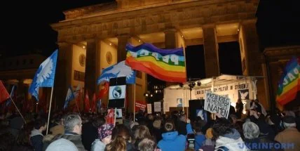 Об этом сообщает корреспондент Укринформа. Вечером 3 декабря возле Бранденбургских ворот собралось несколько сотен человек, многие из которых держали в руках символику Левых (оппозиционная партия).