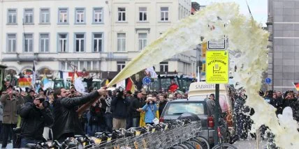 Европейские фермеры в Брюсселе поливают полицию молоком (Фото)