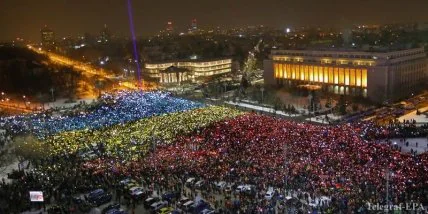 Около 40 тысяч граждан принимают участие в акции протеста в Бухаресте: в 13-й день протестов манифестанты развернули перед зданием правительства румынский флаг.