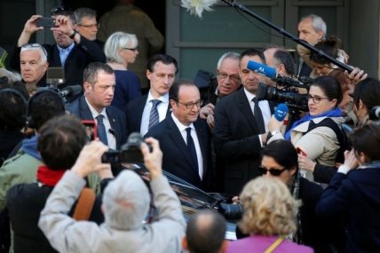 На выборах президента Франции в воскресенье действующий Президент Франсуа Олланд и кандидат Эммануэль Макрон уже отдали свои голоса на избирательном участке.