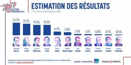Лидером президентской гонки 23 апреля стал Макрон, который набрал 23,75% голосов. За его соперницу Ле Пен проголосовали 21,53% выборщиков.
