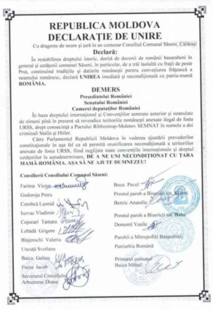 В Молдове мэр одного из сел Каларашського района, а также местные советники приняли символическую декларацию по поводу объединения с Румынией.
