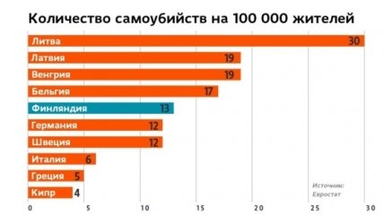 За Литвой в рейтинге расположились Латвия, Венгрия (по 19) и Бельгия (17). В Финляндии от собственных рук ежегодно погибает 13 человек на сто тысяч душ населения, во Франции – 14. Также Германия и Швеция по статистике самоубийств держатся в середине шкалы.