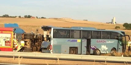 Грузовик, перевозивший зерно, врезалась в автобус, остановившийся на полосе аварийной остановки для замены колеса. От удара грузовик упал на бок. Автобус перевозил 28 детей - в возрасте от трех до 13 лет - и 14 взрослых.