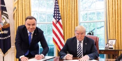 В Польше активно обсуждают и критикуют совместную фотографию президента Польши Анджея Дуды и президента США Дональда Трампа во время подписания соглашения.