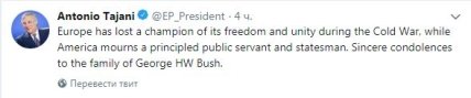 Глава Европейского парламента Антонио Таяни в свою очередь заявил, что "Европа потеряла защитника ее свободы и единства во время "холодной войны". "Искренние соболезнования семье Джорджа Буша-старшего", - говорится в "Твиттере" А.Таяни, опубликованном в субботу.