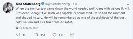 Долг памяти Дж.Бушу-старшему воздал генеральный секретарь НАТО Йенс Столтенберг. "Когда упал железный занавес, мир нуждался в политиках с дальновидностью и волей", - говорится в заявлении главы Североатлантического альянса.