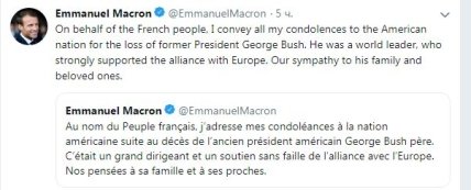 Президент Франции Эмманюэль Макрон адресовал от имени французского народа соболезнования американскому народу в связи с кончиной Дж.Буша-старшего.