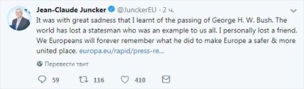 Председатель Европейской комиссии Жан-Клод Юнкер выразил соболезнования в связи с кончиной бывшего президента США Джорджа Буша-старшего, отметив, что тот посвятил себя своей стране и борьбе за свободу.