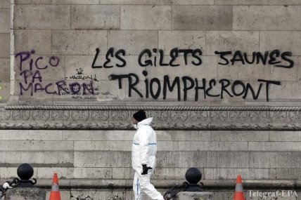 Участники протестов так называемых «желтых жилетов» исписали стены монумента разнообразными надписями вроде "Макрона в отставку", "Желтые жилеты ликуют".