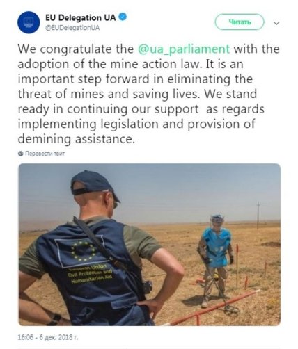 Представительство Европейского Союза в Украине считает важным шагом принятие Верховной Радой закона о противоминной деятельности. Об этом сообщается на странице Представительства в Twitter.