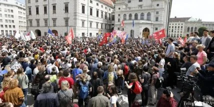 Активисты начали собираться на площади с самого утра, они потребовали отставки вице-канцлера Хайнца Кристиана Штрахе за скандального видео с "богатой россиянкой".