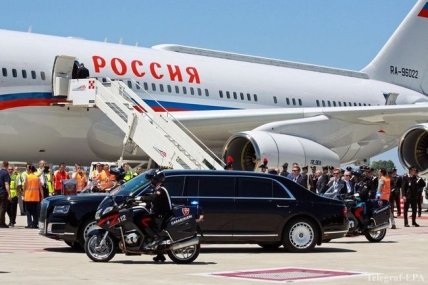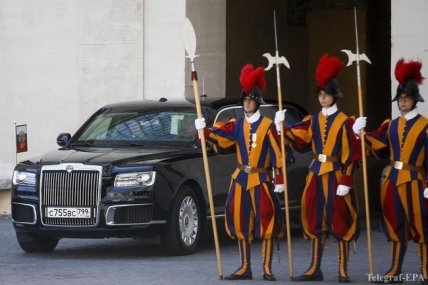 Российский президент передвигается в Риме на собственном бронированном лимузине Aurus Senat.