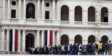 Телеканалы Франции показывают огромную очередь французов, которые во дворе Дома инвалидов под дождем ожидают возможности воздать дань памяти Жаку Шираку.