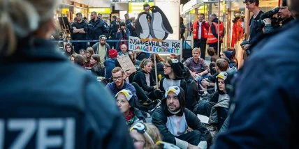 Климатические активисты группы Am Boden Bleiben ( "Оставаясь на земле") провели в воскресенье, 10 ноября, акцию гражданского неповиновения в берлинском аэропорту Тегель.
