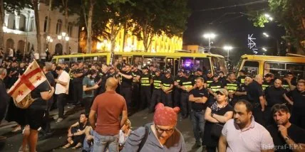 Перед центральным офисом правящей партии Грузии "Грузинская мечта", в котором собралась на заседание парламентское большинство, произошли столкновения между протестующими и полицией, в результате чего пострадали два человека.