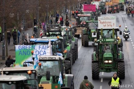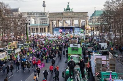 Около 15 тысяч человек, в том числе фермеры на 150 тракторах, устроили марш по центру Берлина в субботу, 18 января, в рамках которого провели акцию протеста перед Бранденбургскими воротами.