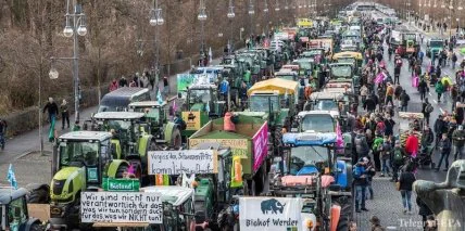 Около 15 тысяч человек, в том числе фермеры на 150 тракторах, устроили марш по центру Берлина в субботу, 18 января, в рамках которого провели акцию протеста перед Бранденбургскими воротами.