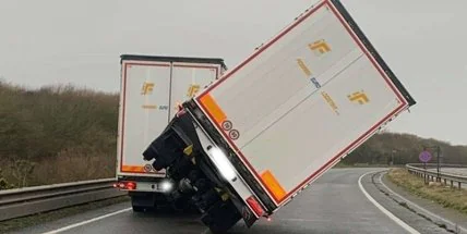 Компания-оператор скоростных дорог в Англии Highways England поместила на "Твиттере" фото падающего от ветра грузовика, водитель которого отделался легким испугом.