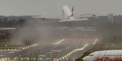 Пользователь YouTube Topfelya показал видеозапись попыток посадки самолетов Embraer E190 и Airbus A380 в аэропорту Бирмингема в неблагоприятных погодных условиях, которые принес на острова шторм Кира.
