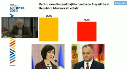 Согласно их данным, Майя Санду заручилась поддержкой 54,7% избирателей, в то время как за Игоря Додона проголосовали 45,3%.