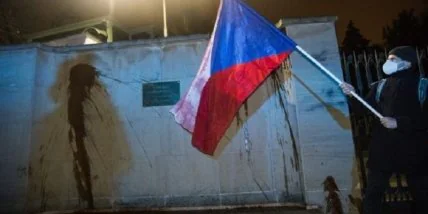 После заявления властей Чехии об обоснованных подозрениях российских дипломатов-работниках спецслужб в подрыве складов с боеприпасами в 2014 году, в результате которых погибли два человека, в Праге у здания посольства проходят различные протестные акции.