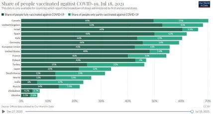 Согласно данным Our World in Data по состоянию на 18 июля, Великобритания занимает первое место в Европе и второе в мире по проценту населения, вакцинированного хотя бы одной дозой. Первое место в мире занимает Канада.
