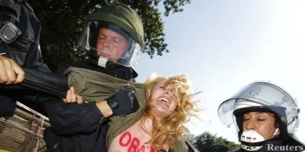 Две активистки женского движения FEMEN в среду в Берлине устроили топлес-акцию протеста во время официального визита президента США Барака Обамы.