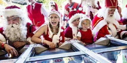 Справка. Конгресс Санта-Клаусов проводится с 1957 года благодаря шоумену местного лунапарка "Баккен" профессору Трибини, мечтавшему о том, чтобы Рождество отмечалось не один, а 2 раза в году.