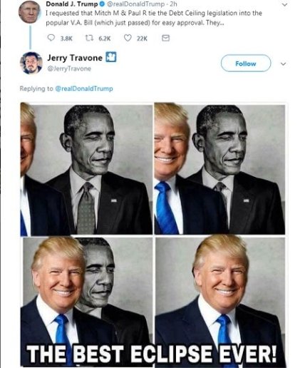 На картинке из четырех секций представлено четыре черно-белых изображения Обамы, которого постепенно закрывает цветная фотография улыбающегося Трампа. Под фотографией сделана подпись: "Самое лучшее затмение!"