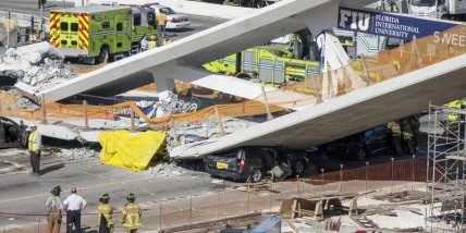 Новопостроенная конструкция железобетонного пешеходного моста упала в четверг на заполненную автостраду на юге штата Флорида, США, унеся жизни по меньшей мере четырех человек и ранив десяток других.