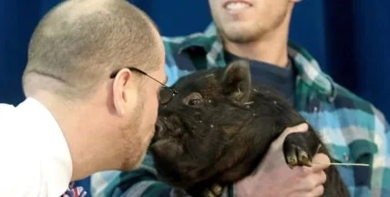 После того, как директор поцеловал свинью в пятачок, на сцену вышла его начальница, председатель образовательного округа Линн ДиПьетропо и под восторженные крики детей также поцеловала животное.
