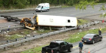 В четверг, 17 мая, в американском штате Нью-Джерси столкнулись на шоссе школьный автобус и самосвал.