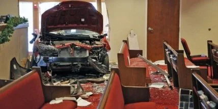 Машина протаранила стену здания церкви насквозь. Шесть человек получили травмы и порезы от осколков витражей.