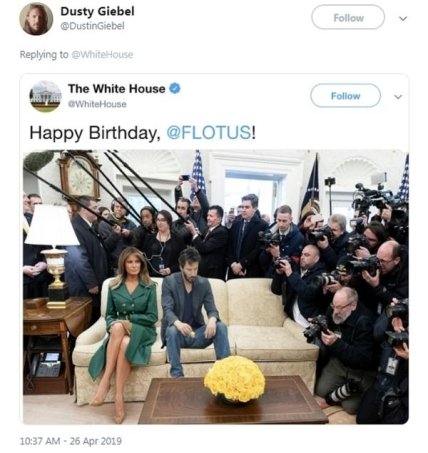 Накануне первая леди США Мелания Трамп отпраздновала свой 49-й день рождения. Администрация президента США в Twitter выбрала для поздравления фотографию с Меланией Трамп, которая в одиночестве сидит на диване в Овальном кабинете в окружении группы фотографов.