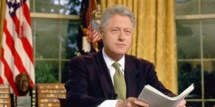 Клинтон позирует в Овальном кабинете, развалившись в кресле, и с улыбкой показывает пальцем на зрителя.